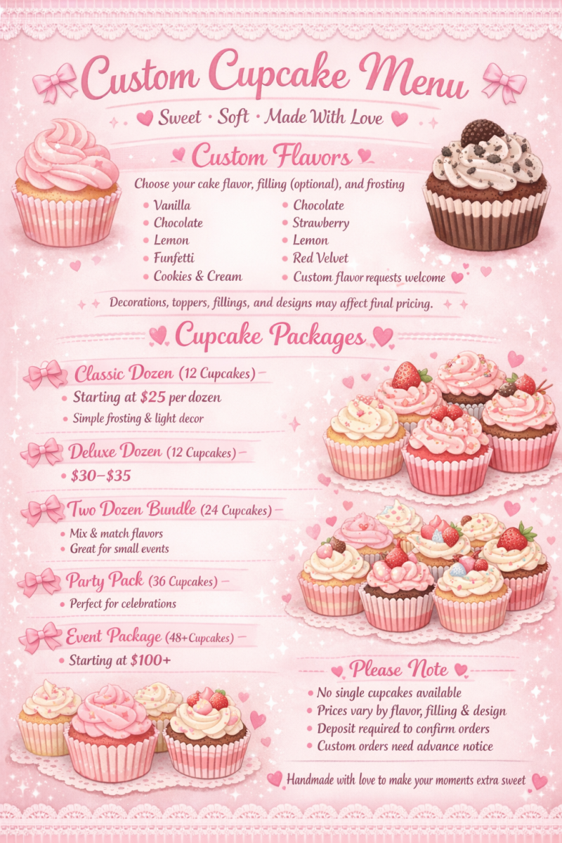 Looking to place an order for delicious freshly made cupcakes or handcrafted dipped treats? Have a custom dessert idea for your special event? Our team at roundrocksweetoccasions is ready to help bring your sweet visions to life. Reach out to us for inquiries about availability, pricing, flavors, and to discuss custom designs that perfectly match your event's theme or special occasion.